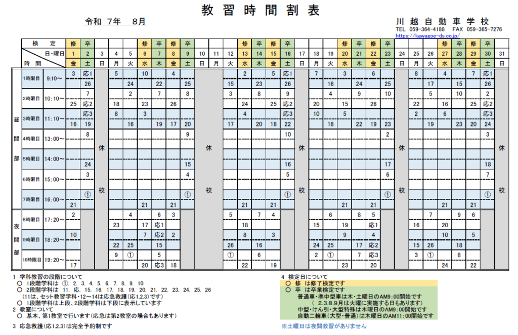 | 夜間の部 (土曜日を除く) | 17:30 ~ 20:20 学科講習時間は上記実技教習時間と同じで、昼間・夜間部を問わず受講できます。 |
